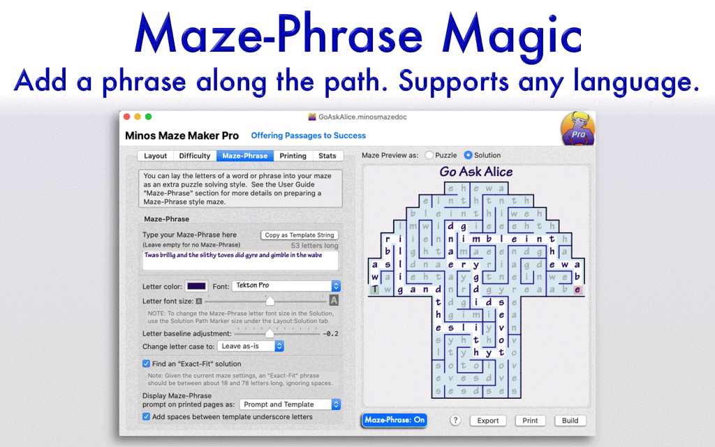 Maze-Phrase Mode - Add a word or phrase, and it will be laid along the solution path. The rest of the maze will be filled with letters from your phrase, and only the solution path will contain the entire correct phrase.