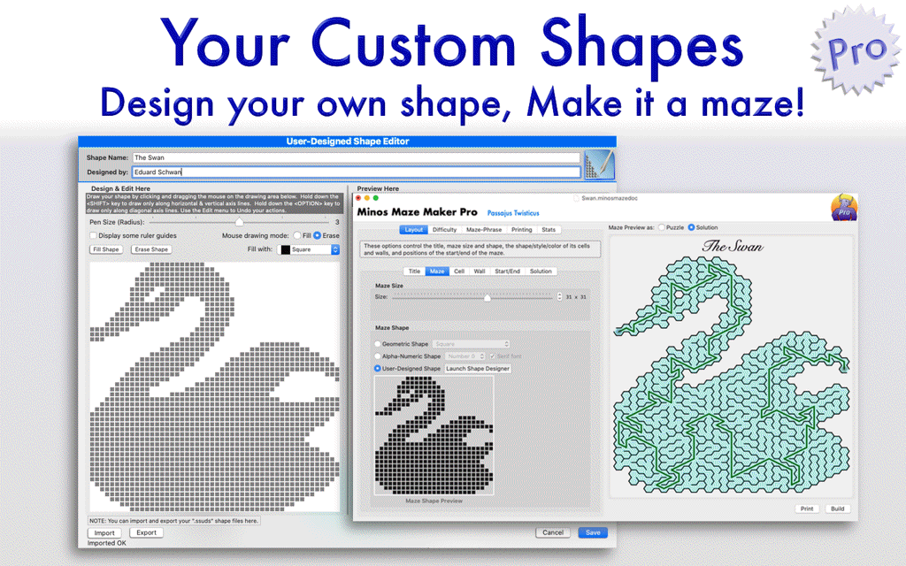 Many Shapes and Sizes - Choose from many built-in maze shapes, several cell shapes, and the mazes can range in size from as small as 5x5 up to 50x50, or up to 80x80 in the Pro product.