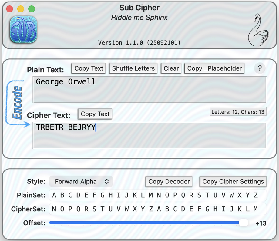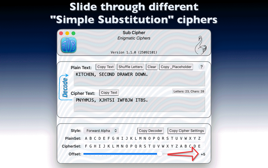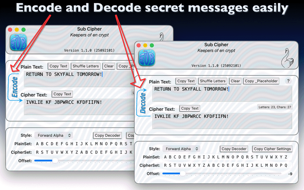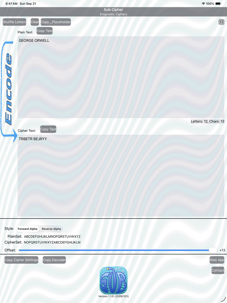 Sub Cipher is an easy-to-use Encoder/Decoder app, which can encode or decode "simple substitution ciphers."
