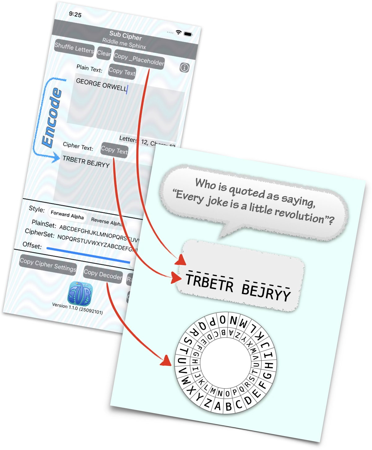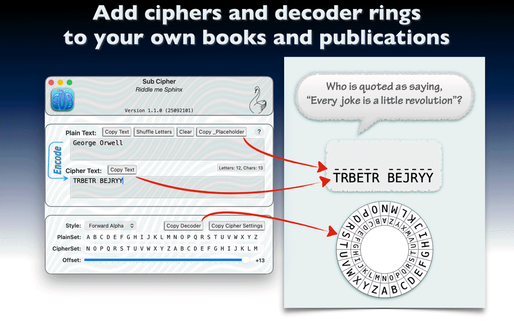 Sub Cipher creates the encoded text, placeholder-text, and even a magic decoder wheel that you can add to your own books and publications.