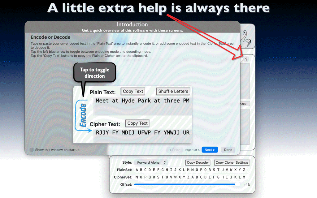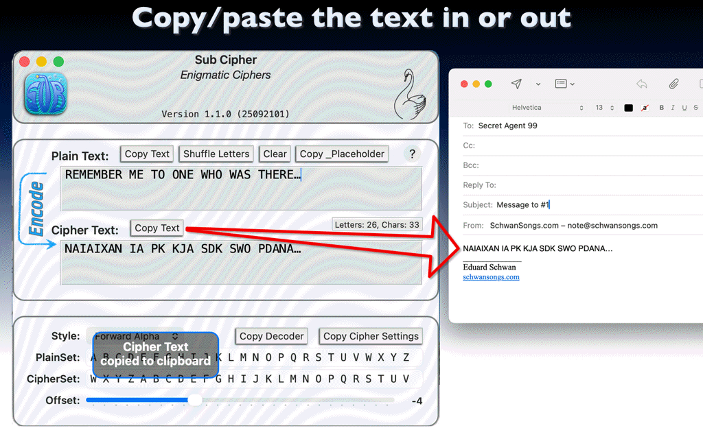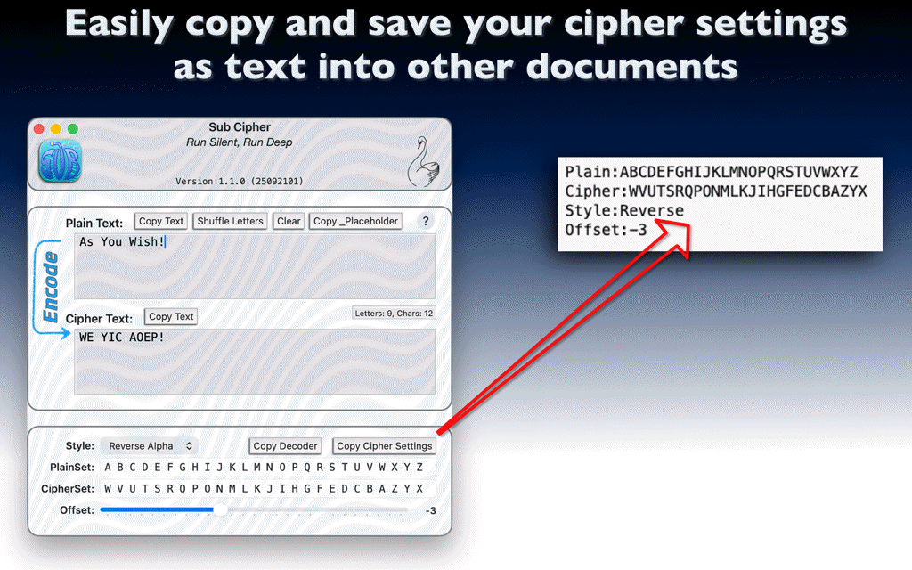 You can also capture the settings you have dialed in (as lines of text) to save in another document. This can be useful if you are publishing a newsletter or book of ciphers, and want to keep the settings you used with each cipher along with the cipher itself.