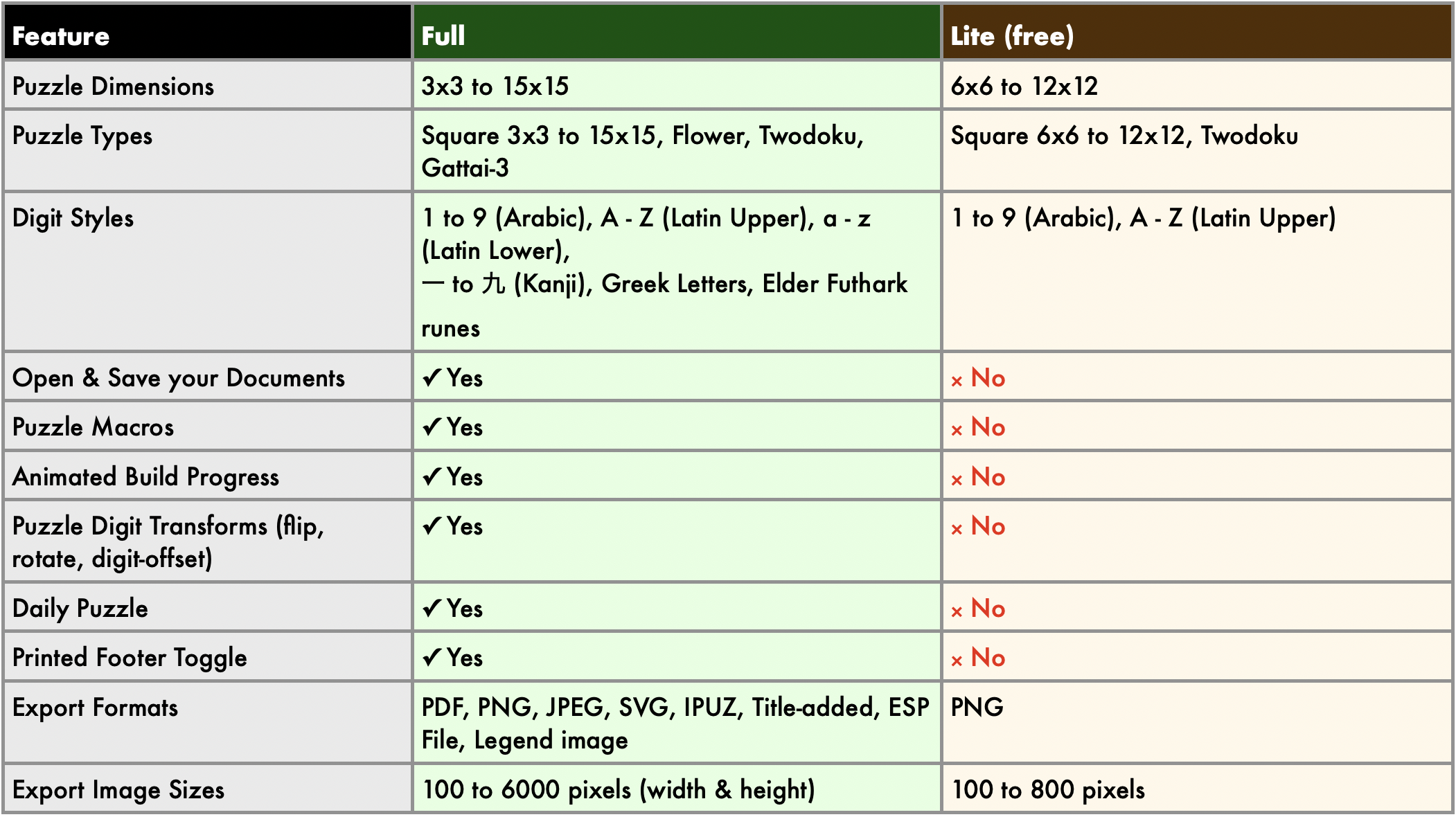 Fully Featured - The Full version offers many board styles like Standard Square, Flower, Twodoku, and many sizes from 3x3 up to 15x15 (Click here for pricing and download link)