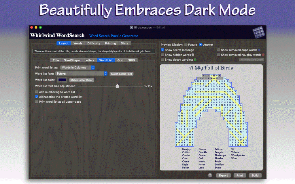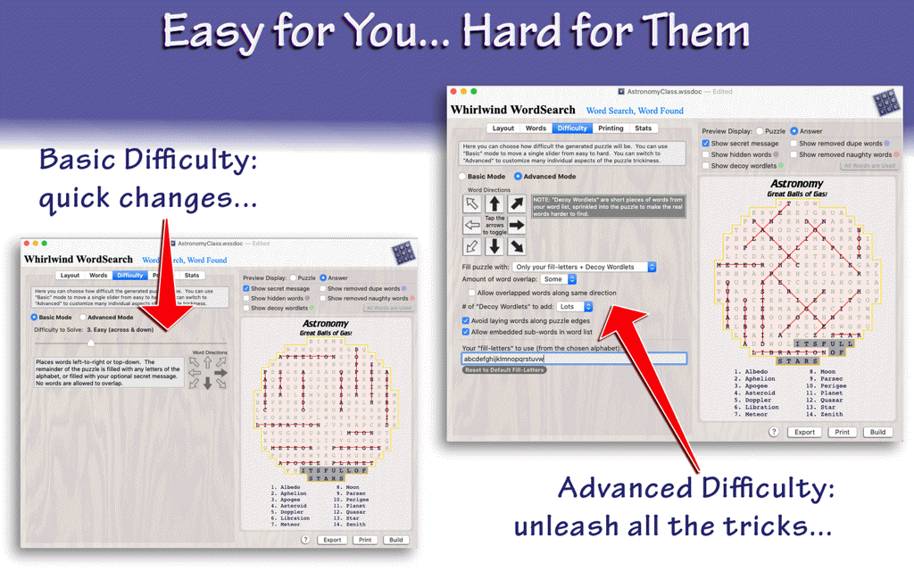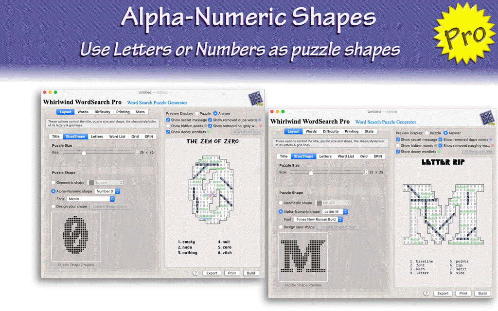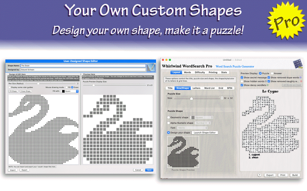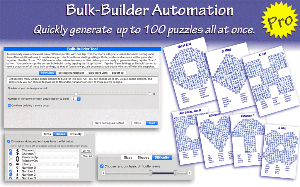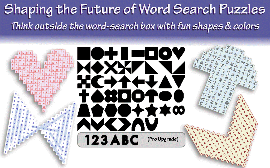 With the Pro upgrade, you can bulk-build up to 100 puzzles at a time from your own large word lists, choose from even more shapes, or even design your own shape and turn it into a puzzle. You can also export the entire puzzle and answer information in computer-readable "ESP File" format for importing into your professional publishing workflow, or into your own game engines for interactive puzzle-play!