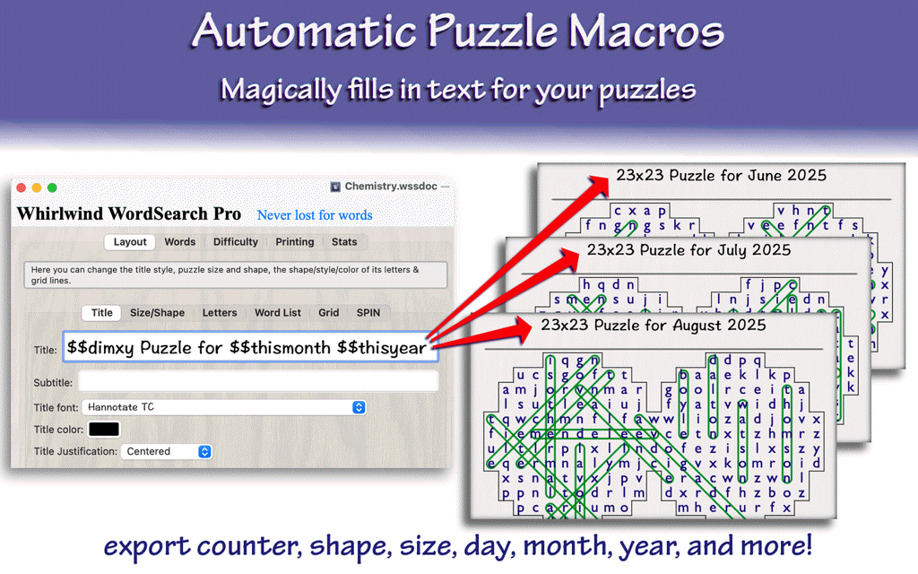 Building a new puzzle every month? Let Whirlwind WordSearch automatically add the name of the month into your puzzle title for you! Also add day-of-week, year, puzzle shape and size, and more.