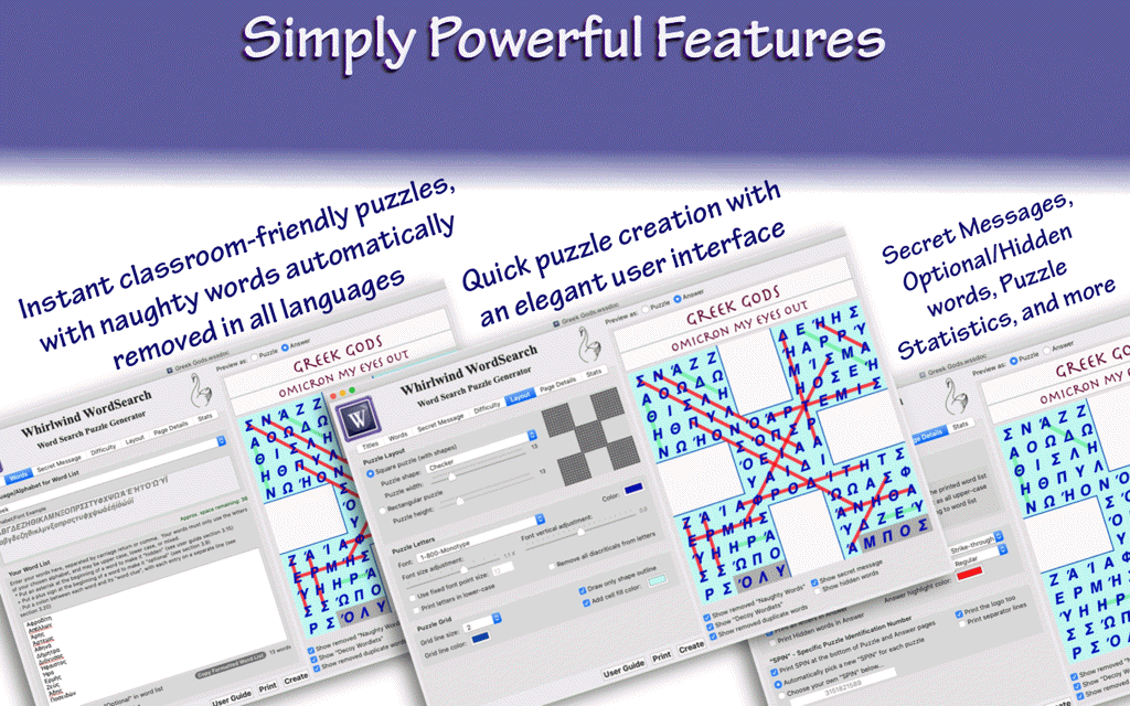 Hide secret messages within the puzzle, prompt with clues instead of the words, Instant Naughty-word elimination in all languages, and so much more...