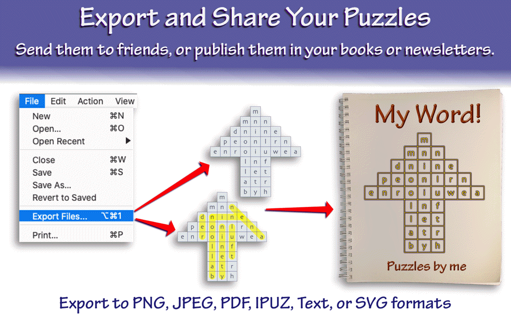 You can export high-quality puzzle and answer images for the web, or into your own word processor for publishing in books, newsletters, social media/blogs, or classroom handouts. The puzzles are yours to publish and sell, no commercial licensing required.
