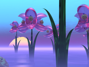 Float through a garden of crystal flowers, growing in a serene liquid pool at sunset.