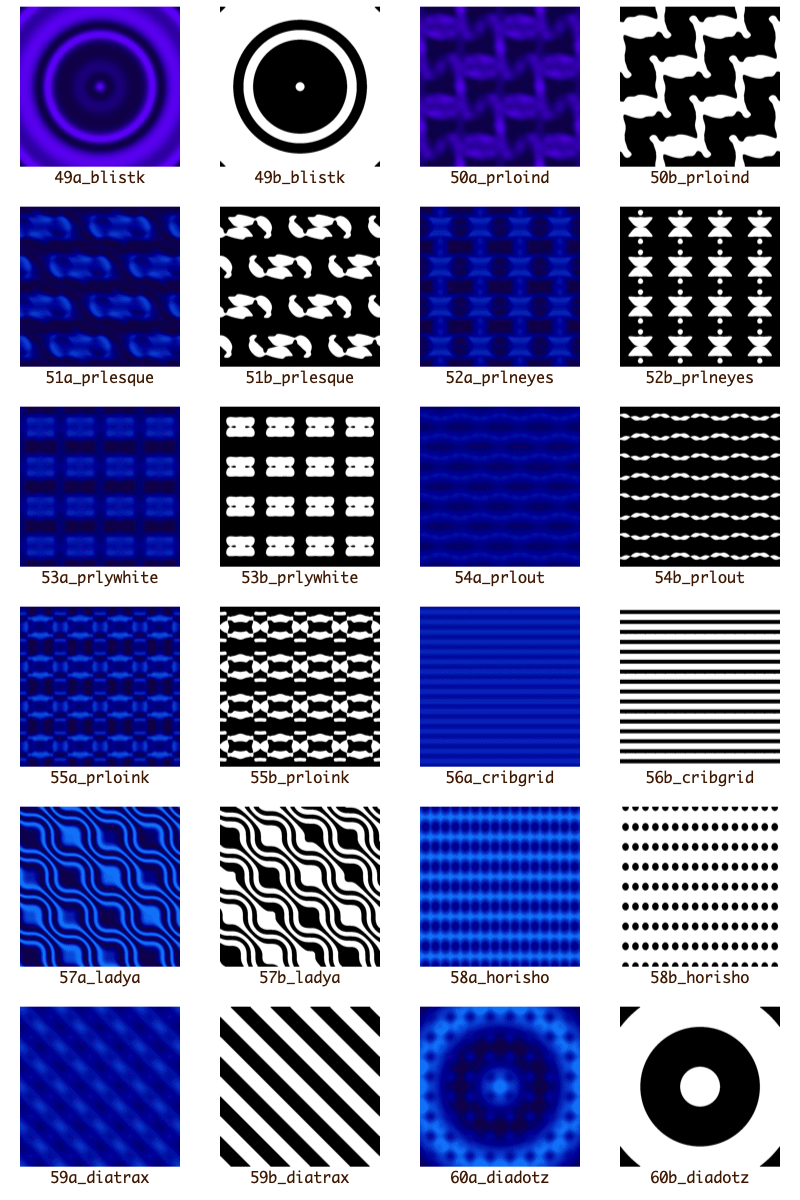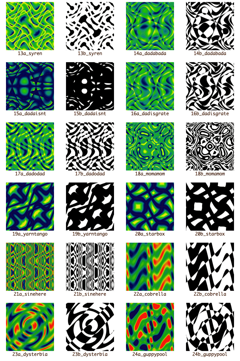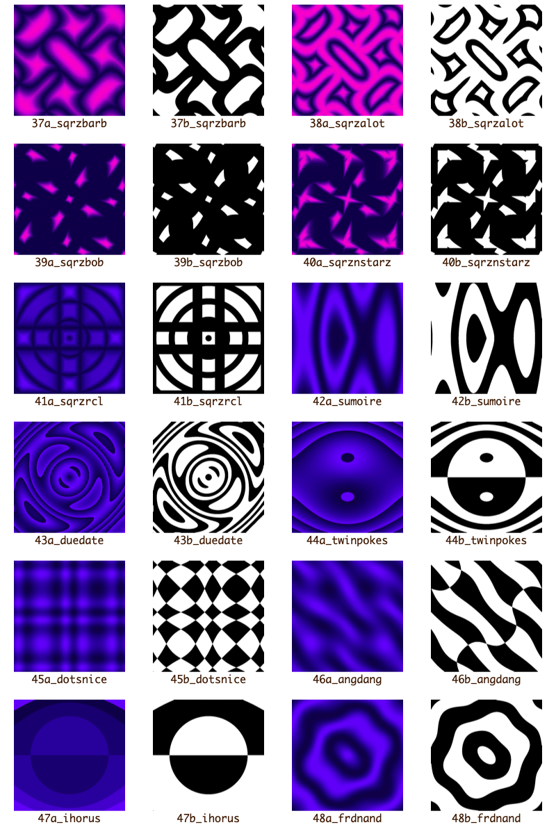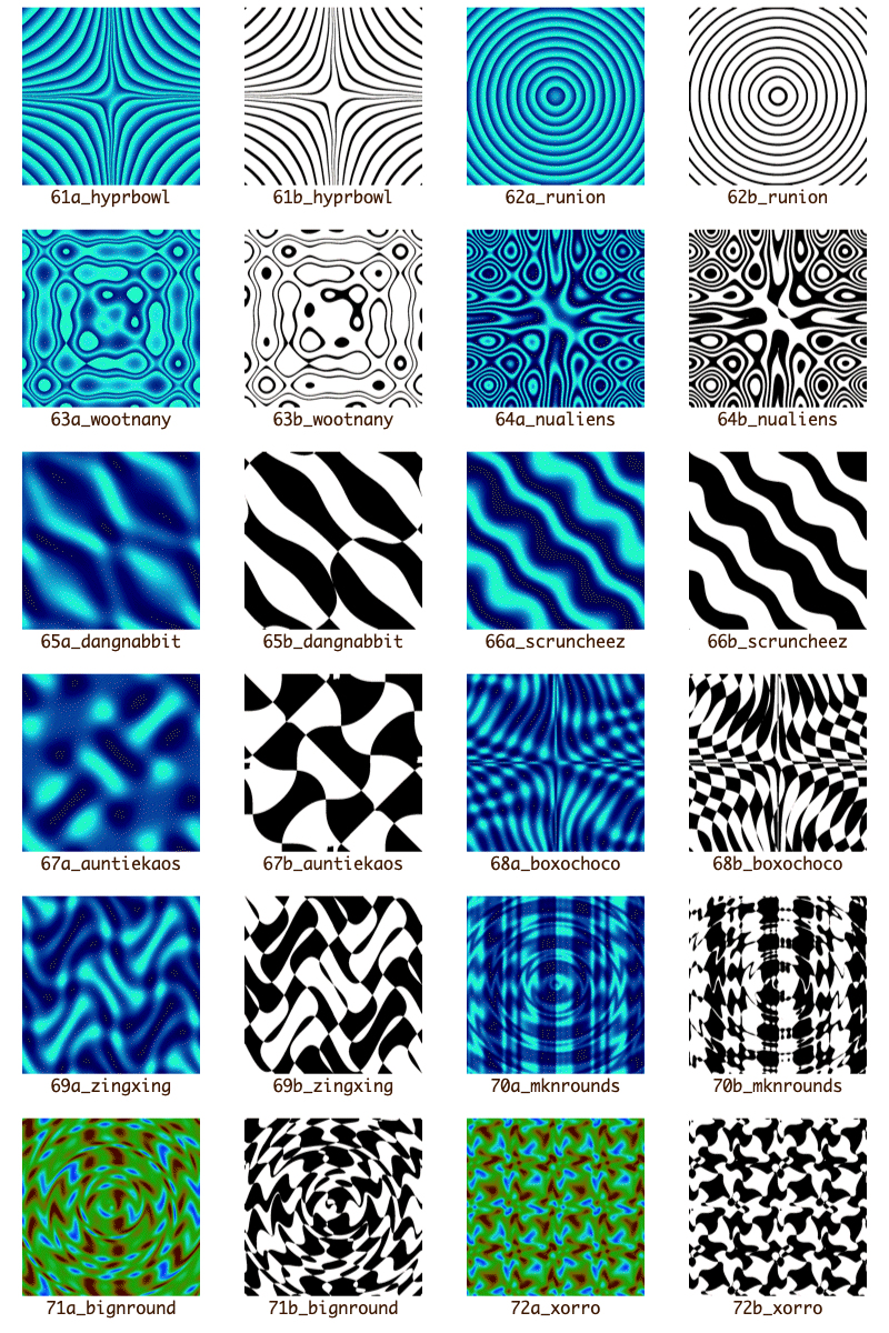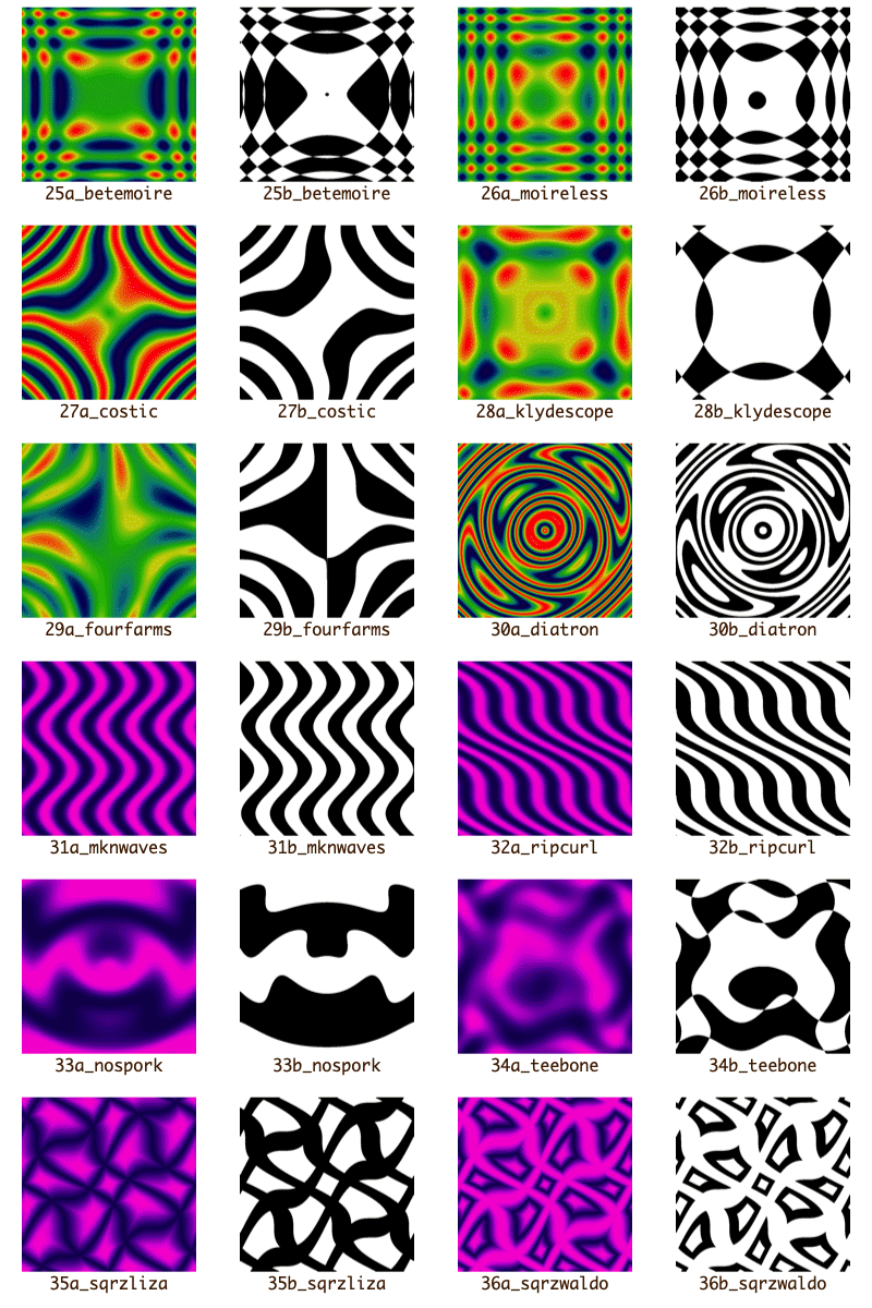 There are 78 basic patterns (or functions) to choose from, and from there you can alter any of them by using different colors and coloring styles, zoom-levels, distortions to the patterns, etc.